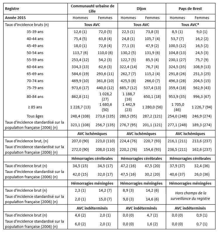 L’analyse de l’évolution entre 2002 et 2014 des taux standardisés de patients hospitalisés pour AVC montre une légère diminution chez les hommes (-2,4 %) et les femmes (-2,2 %) tous âges confondus. En revanche, chez les moins de 65 ans, ce taux a significativement augmenté de près de 20 % entre 2002 et 2014, aussi bien chez les hommes que chez les femmes. Ces résultats sont cohérents avec les données du registre des AVC de Dijon qui montraient une augmentation de l’incidence des AVC chez les moins de 55 ans entre 1985 et 2011.
