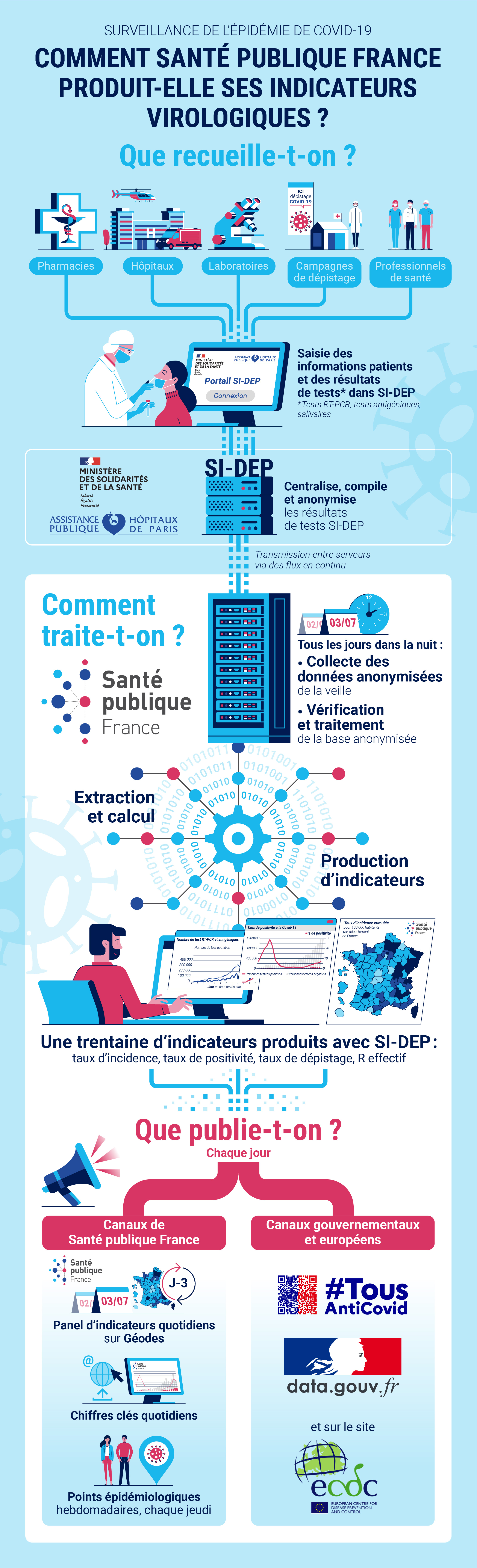 Tout savoir sur la production des indicateurs virologiques dans le cadre de la surveillance de l'épidémie de Covid-19 en France : recueil des données, saisie des informations patients et des résultats de tests dans SI-DEP, centralisation, compilation et anonymisation des résultats, traitement, productions des indicateurs.
